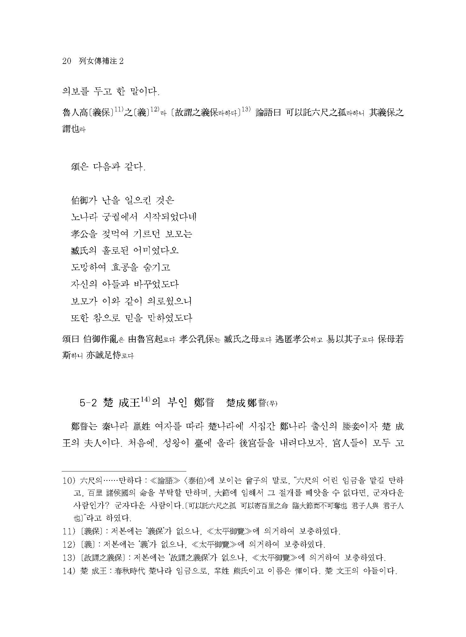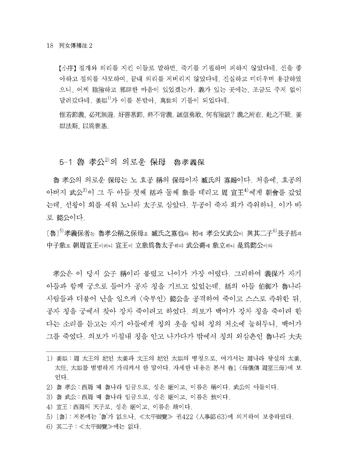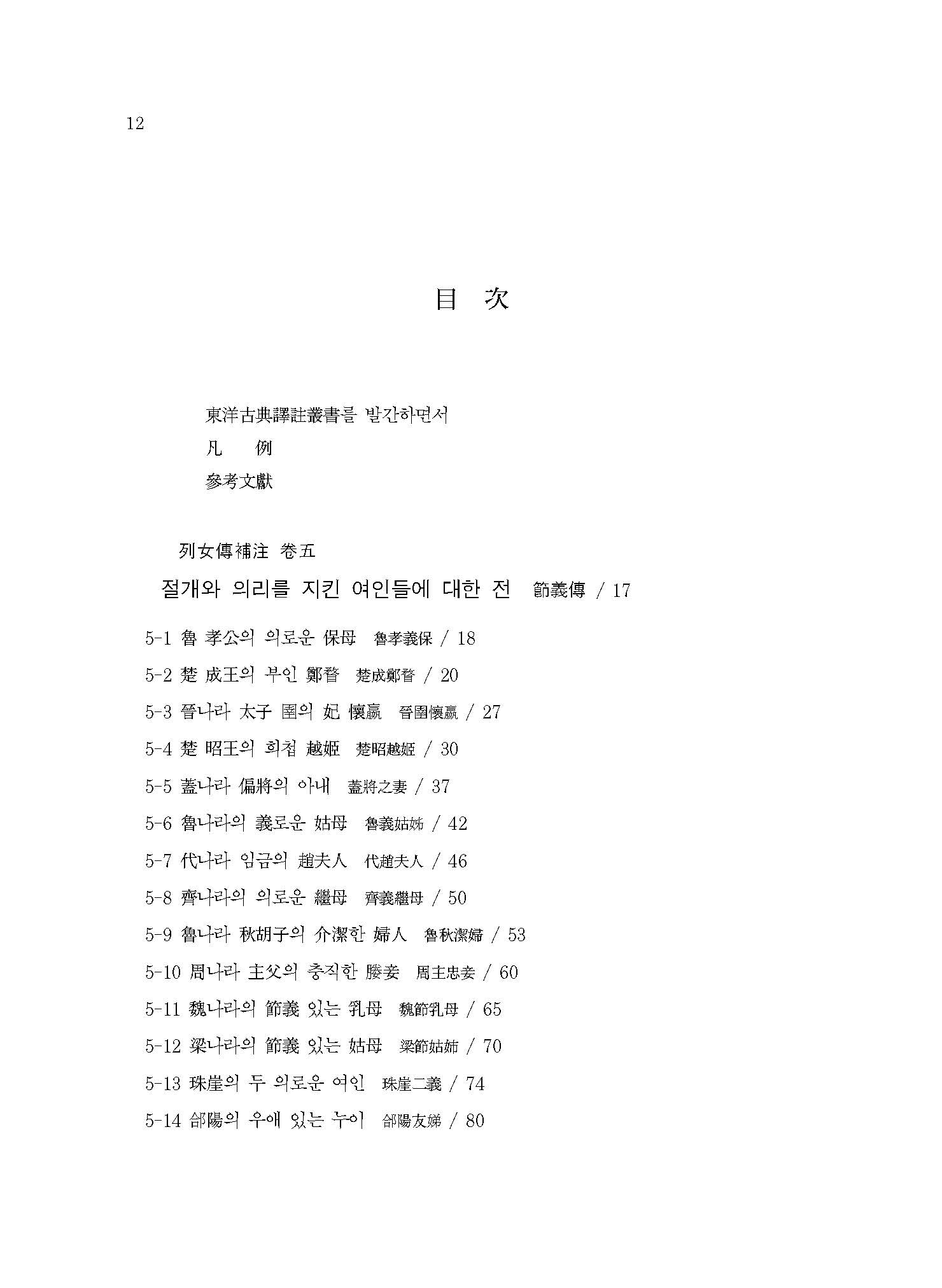 본서는 ≪열녀전≫을 정확하게 번역하는 데 목적을 두는 것에서 한 걸음 더 나아가 ≪열녀전≫의 정본화定本化에도 심혈을 기울였다. 이것이 신뢰할만한 교정과 주석 작업이 이루어진 ≪열녀전보주≫를 저본으로 선택한 이유이고, 또 ≪열녀전교주≫와 ≪열녀전집주≫의 주석도 적극적으로 반영하여 교감 작업에 공을 들인 이유이기도 하다.