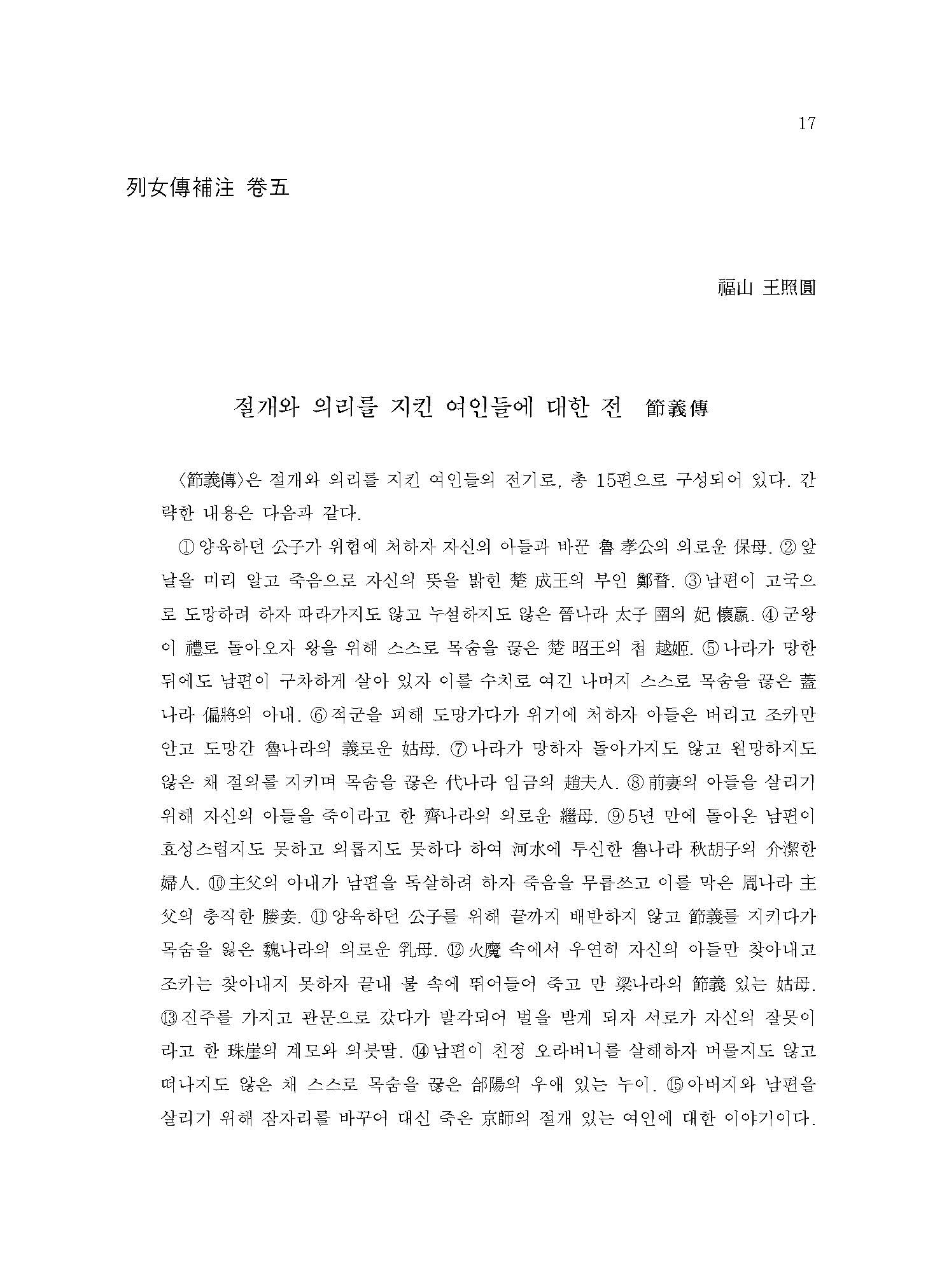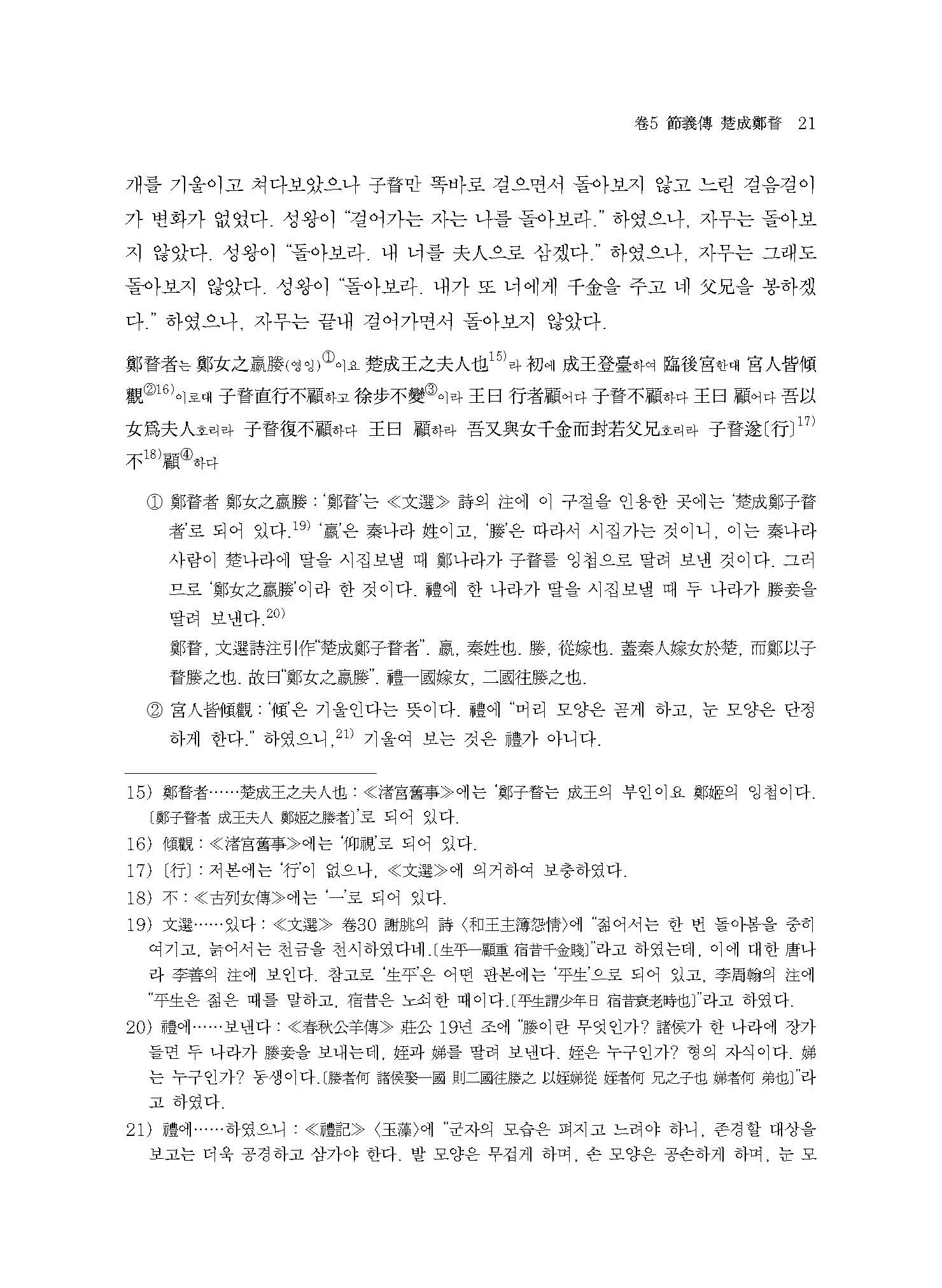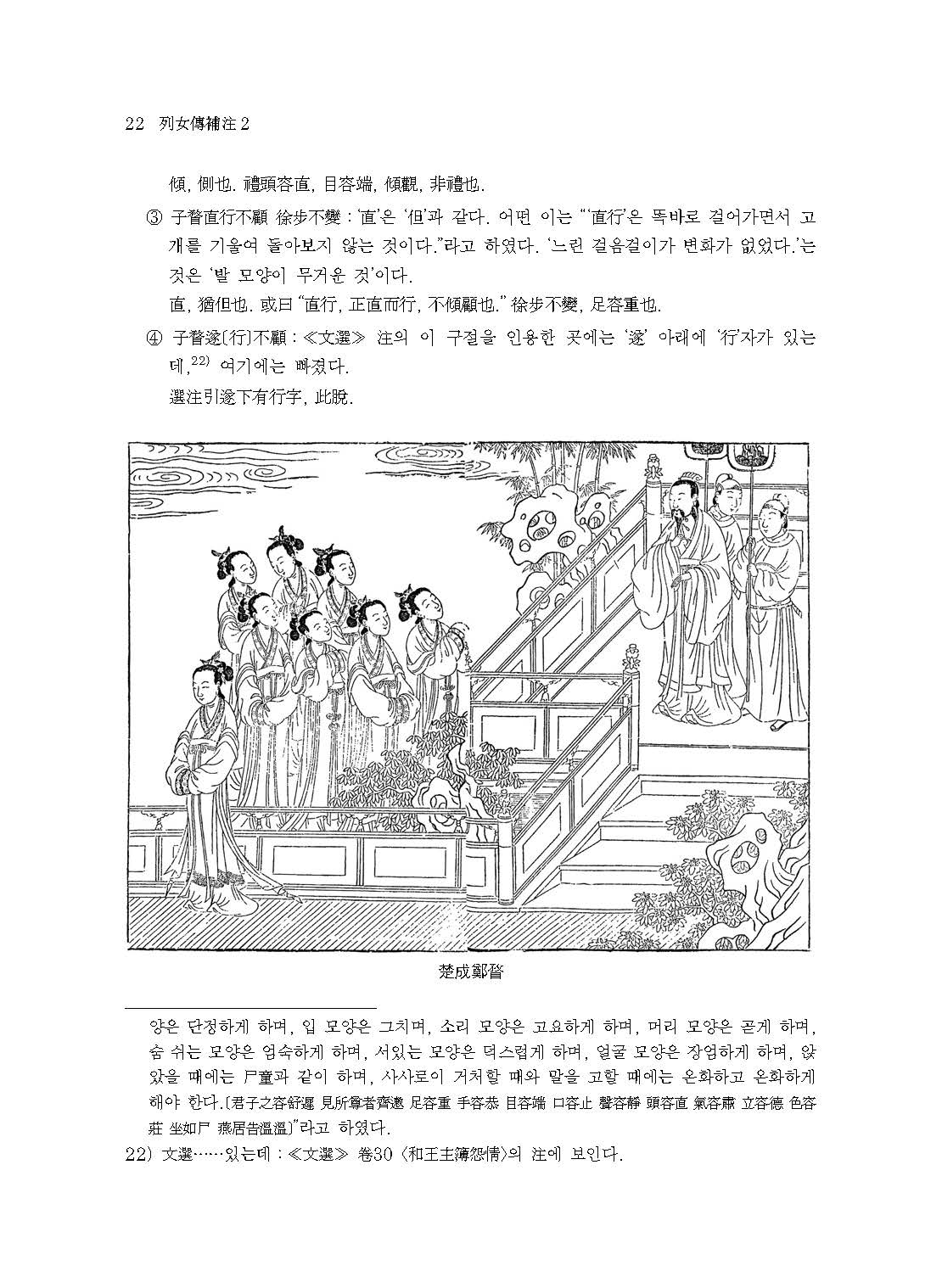 본서는 청?나라 때의 대표적인 ≪열녀전≫ 주석서 가운데 교감과 주석이 적절하고 장용臧庸과 마서진馬瑞辰 등 청나라 고증학자들의 교정校正이 덧붙여진 왕조원王照圓의 ≪열녀전보주列女傳補注≫를 저본으로 하였다. 본서가 기존에 출간된 ≪열녀전≫ 국역서들과 차별점을 가지는 부분은 바로 왕조원의 보주補注와 장용 등의 교정 등 저본에 실린 원주原註를 전부 완역하여 수록하였다는 점이다. 뿐만 아니라 청나라 때의 다른 대표적 주석서들인 양단梁端의 ≪열녀전교주列女傳校注≫와 소도관蕭道管의 ≪열녀전집주列女傳集注≫의 주석도 다양한 견해를 소개하고 독자들의 이해에 도움을 주기 위해 역자들이 필요한 범위 내에서 선별하여 수록하였다.
