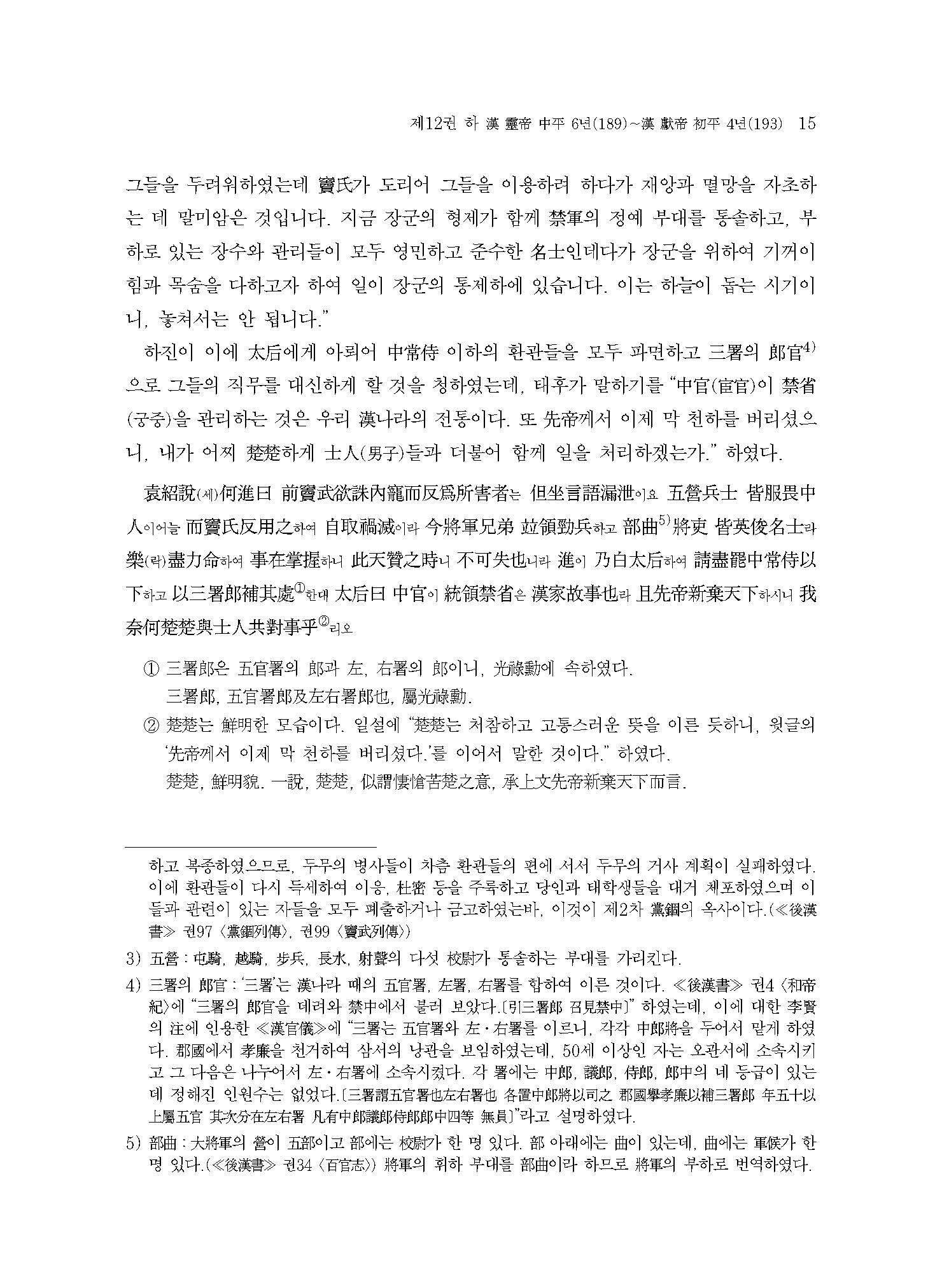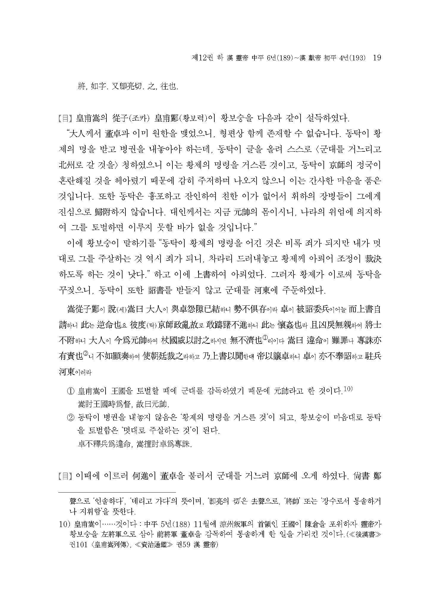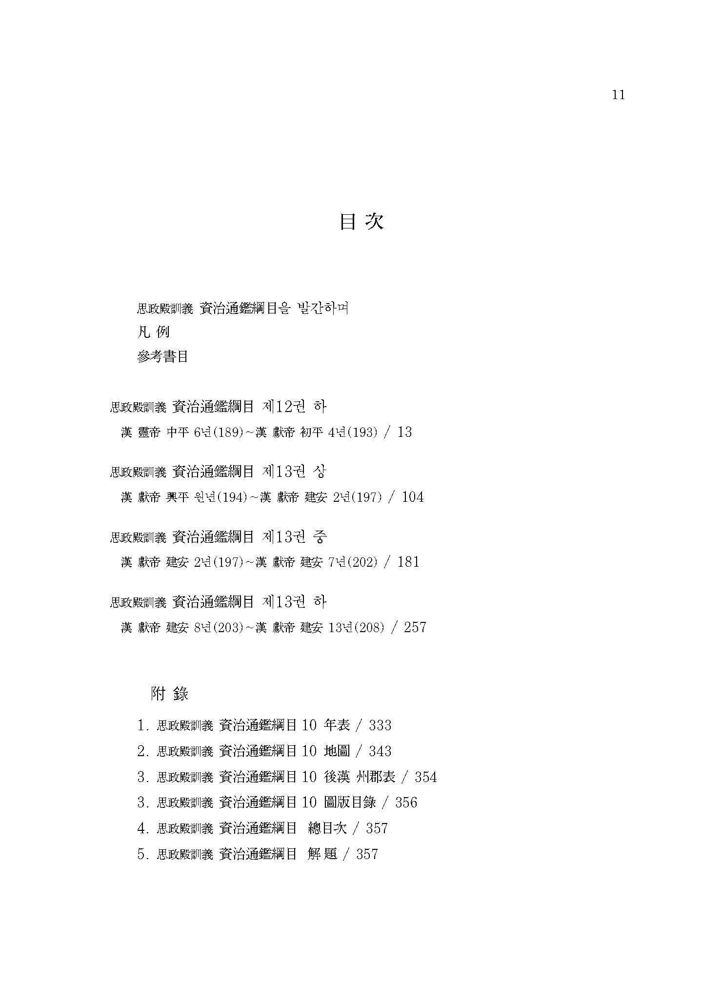 ≪역주 사정전훈의 자치통감강목≫는 모두 39책으로 간행될 예정이다. 본서는 원본의 편집 체제의 특징을 그대로 구현하고자 하였으며, 번역문은 현대적으로 표현하여 일반 독자들이 번역문만 읽어도 그 내용을 쉽게 이해할 수 있게 하였다. 또한 번역문 아래 원문을 함께 실어놓았으며 원문에는 원문의 문장구조를 한국적인 방식으로 이해하는 데 도움이 되도록 우리나라 전통적 방식의 현토懸吐를 하였을 뿐만 아니라 교감을 하여 학술적 연구에 도움을 주고자 하였다.