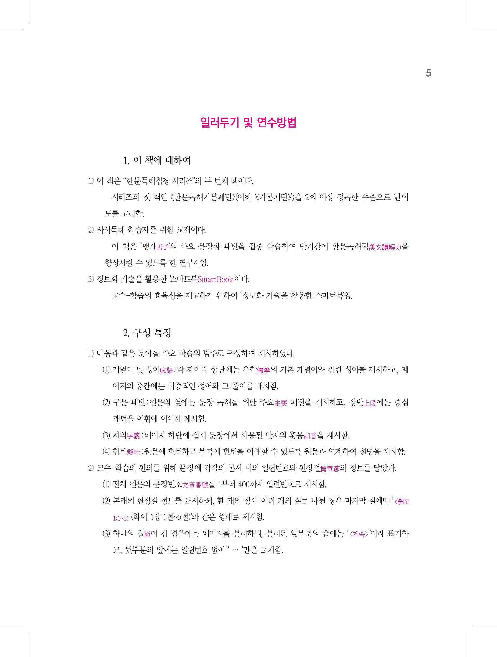 이 책은 ‘한문독해첩경시리즈’의 다섯 번째 권으로, 앞서 출간된 《25개정판 한문독해기본패턴》,《논어독해 첫걸음》의 뒤를 잇습니다. 시리즈는 이후 《대학·중용독해 첫걸음》 등으로 이어질 예정이며, 추후에는 중국어·일어·영어권 학습자를 위한 콘텐츠도 선보일 계획입니다.