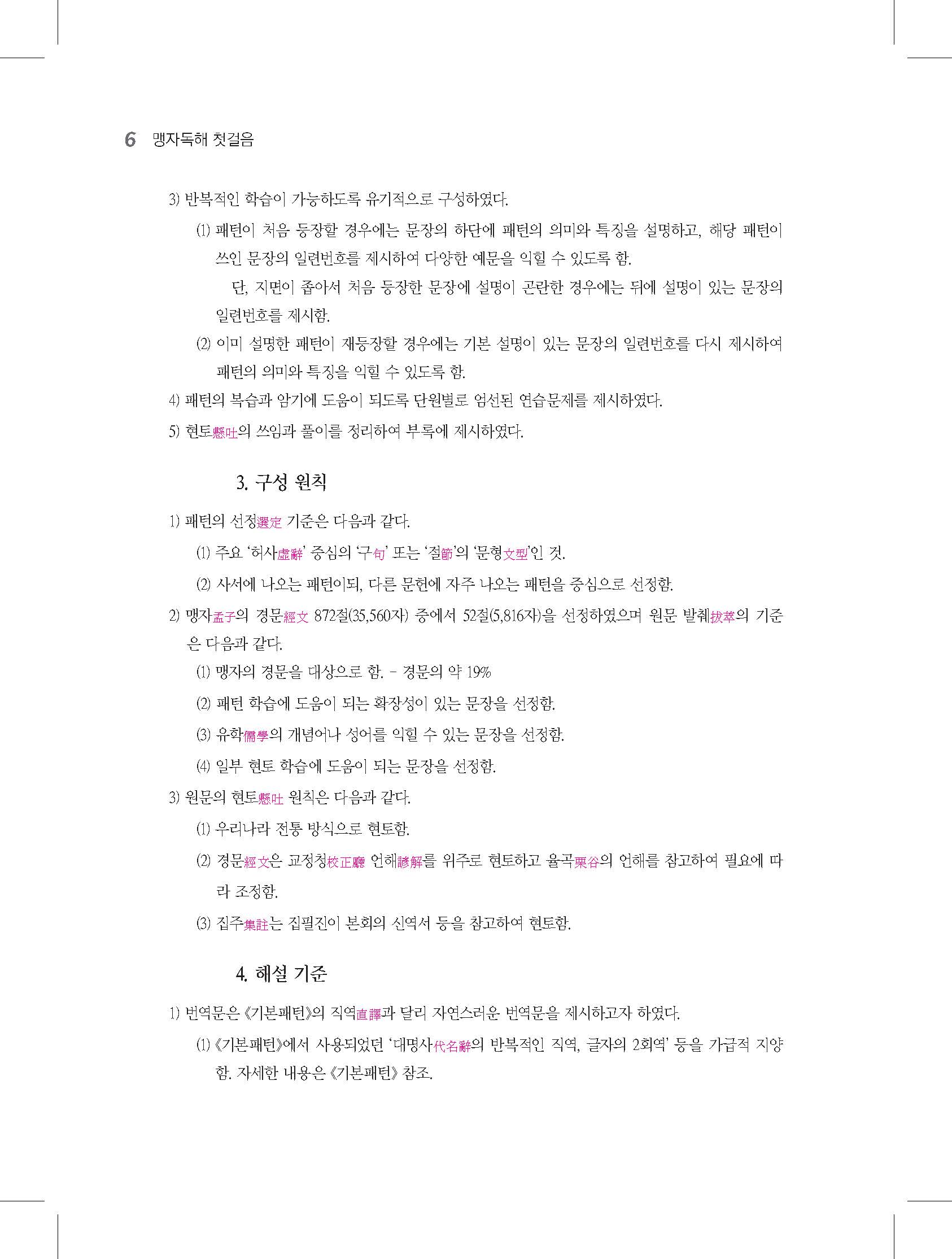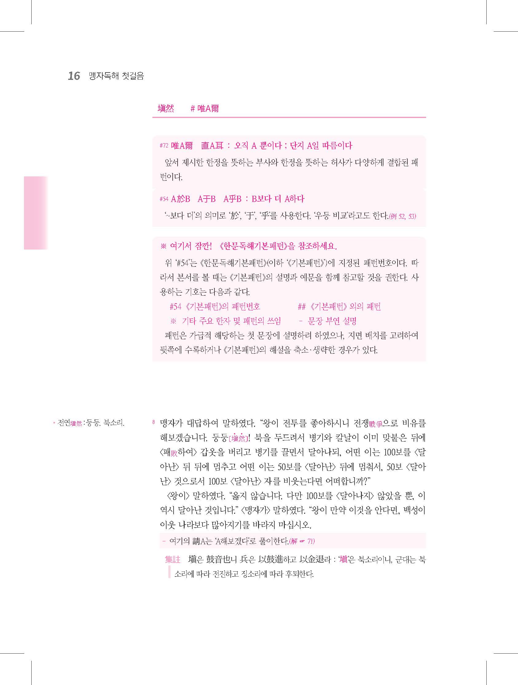 《맹자독해 첫걸음》은 이러한 전통적 방식에 현대적 분석 기법을 결합하여, 보다 효율적이고 체계적인 학습이 가능하도록 구성되었습니다. 특히 한문 문장에서 자주 등장하는 기본 문장 패턴을 정리하고, 그것을 실제 ‘맹자’ 문장 속에서 반복적으로 접하게 함으로써 자연스럽게 구조를 익히도록 설계하였습니다. 마치 영어 문장을 패턴으로 학습하듯, 한문도 일정한 문법 구조가 반복됨을 체득하게 만드는 것이 이 책의 핵심입니다.