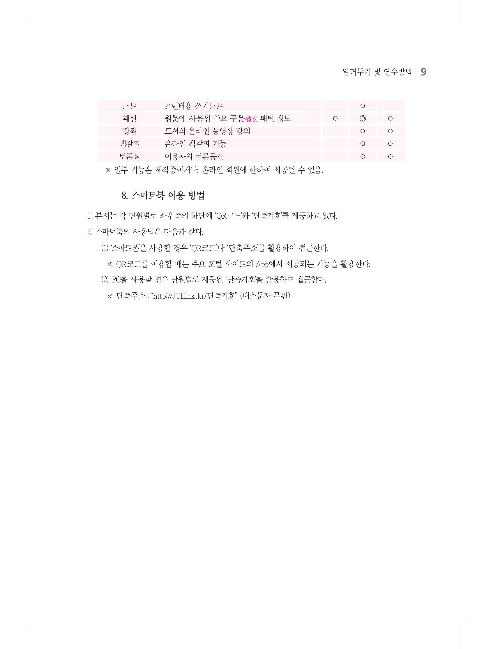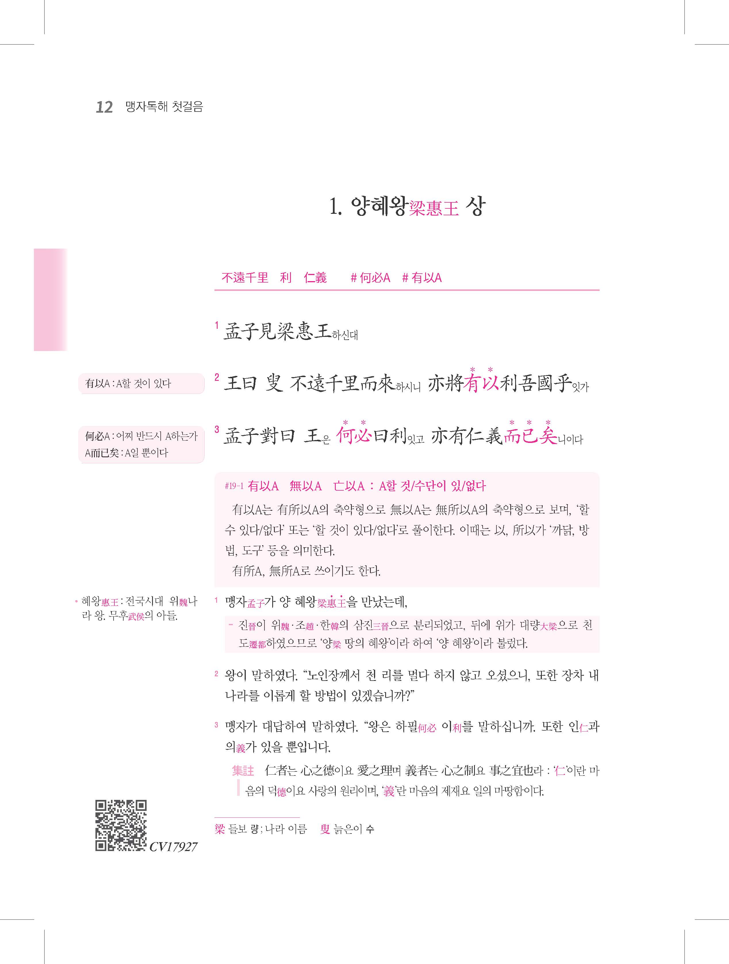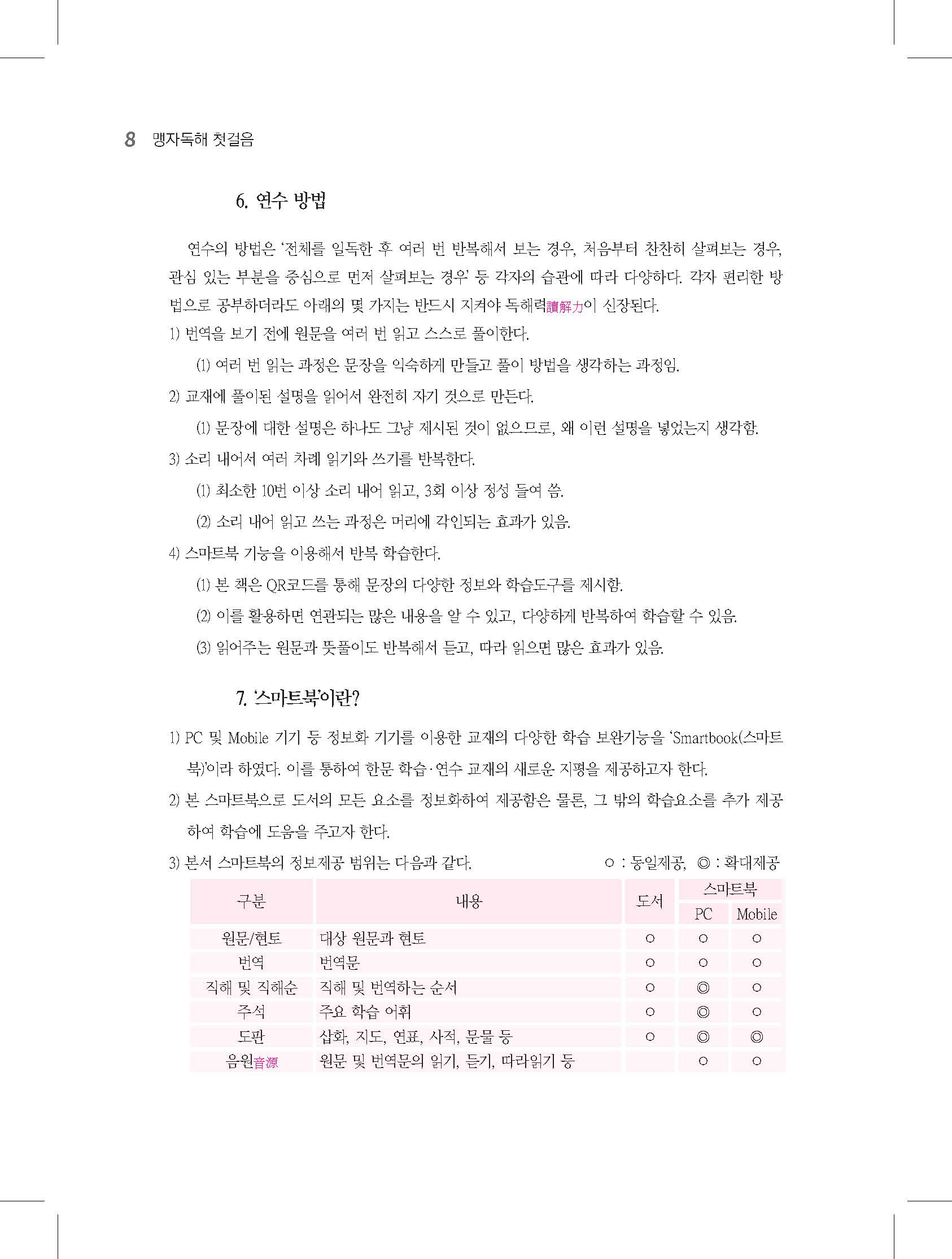 특히 이 책은 QR코드 연동 학습 시스템을 통해 스마트한 연수 환경을 지원합니다. 각 소단원마다 제시된 QR코드를 활용하면 ‘따라 읽기’, ‘독음 익히기’, ‘문장 끊어 읽기’, ‘패턴 복습’, ‘축자逐字 해석’ 등 다양한 기능을 이용할 수 있습니다. 학습자는 언제 어디서든 맹자 한문 문장을 반복 학습할 수 있으며, 교사는 수업 자료로서 손쉽게 활용할 수 있습니다.