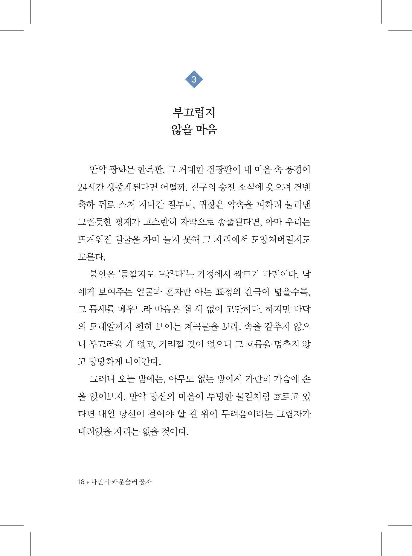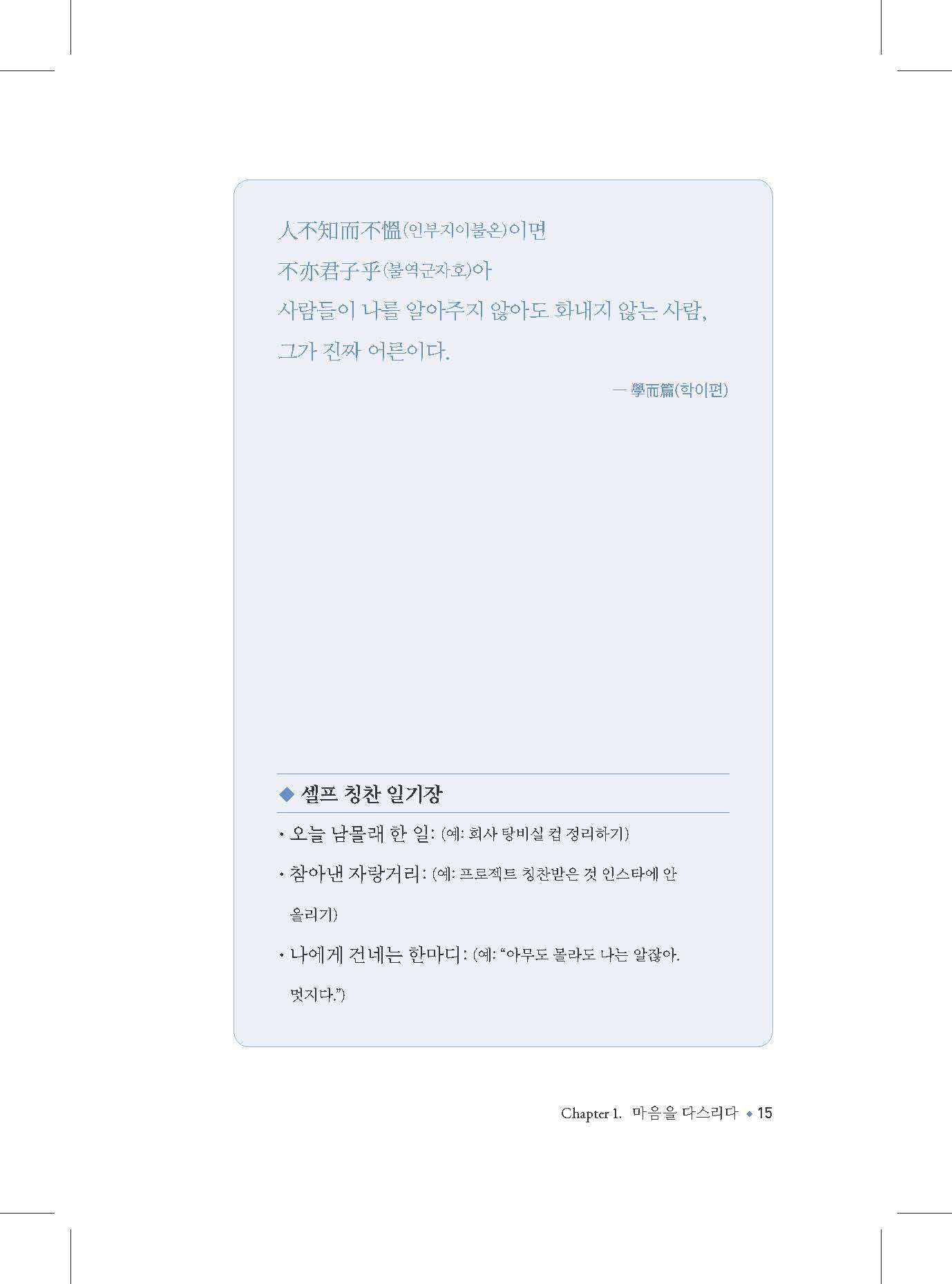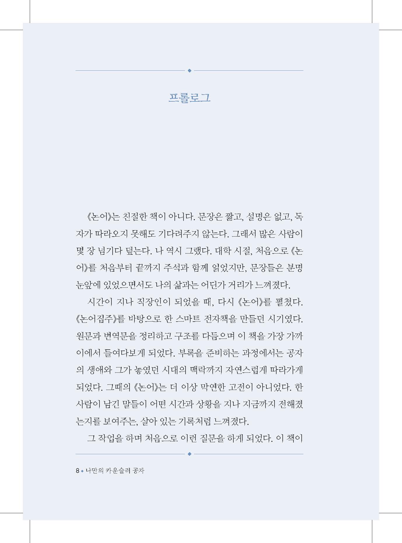 이 책은 딱딱한 학문적 해설서가 아닙니다. 저자가 직장 생활의 치열한 고민 속에서 길어 올린, ‘나를 지키는 문장’들을 담았습니다. 마음을 다스리는 법부터 복잡한 인간관계, 말의 무게까지. 삶의 흐름에 맞춰 재구성된 공자의 말들은 단순한 위로를 넘어, 삶의 기준을 세워주는 든든한 버팀목이 됩니다.